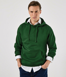 Drop shoulder style. Two panel jersey lined hood with flat lace drawcord. Taped neck and shoulders. Front pouch pocket. Ribbed cuffs and hem. Twin needle stitching.
