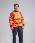 Certified to EN ISO 20471:2013+A1: 2016 Class 3, HV Orange/Navy also conforms to RIS/3279/TOM Issue 1:2016, Ribbed contrast colour collar, cuff and hem, Inner fabric brushed fleece, Reflective tape over shoulder and around body